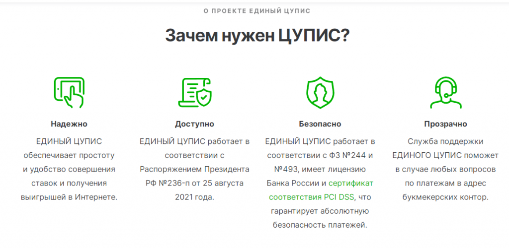 Расшифровка наименования организации — «Центр учета переводов ставок». Сервис открывает личные кабинеты российским клиентам легальных букмекеров. Расчеты игроков с БК проходят под контролем ЦУПИС, который обеспечивает сохранность вложений.