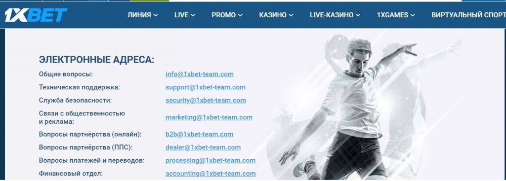 - для онлайн-сотрудничества — b2b@1xbet-team.com и др.