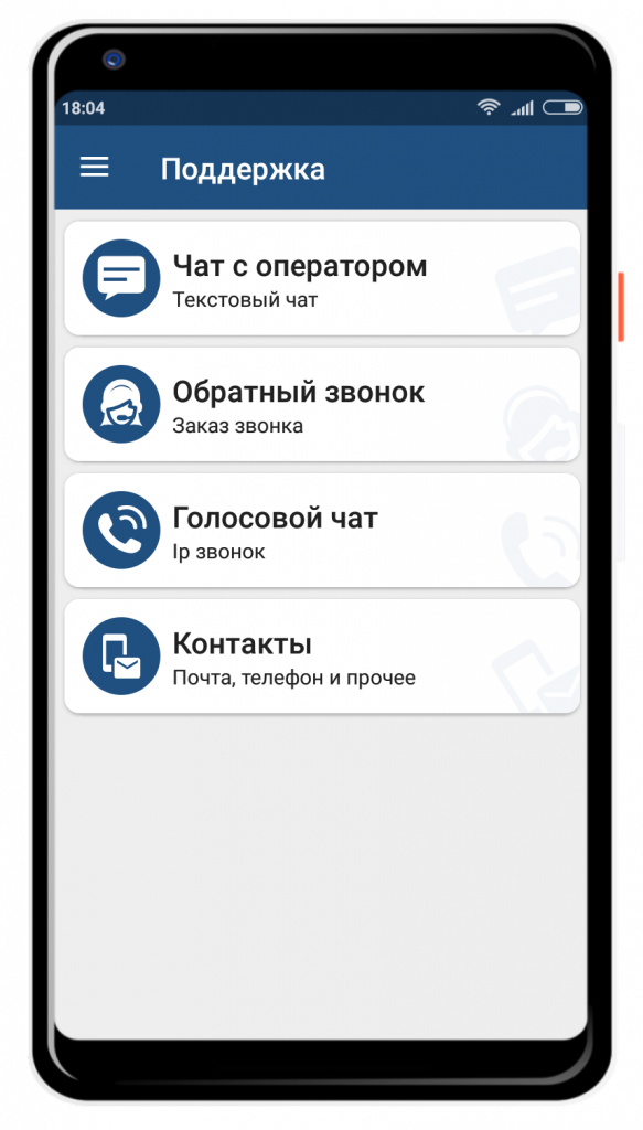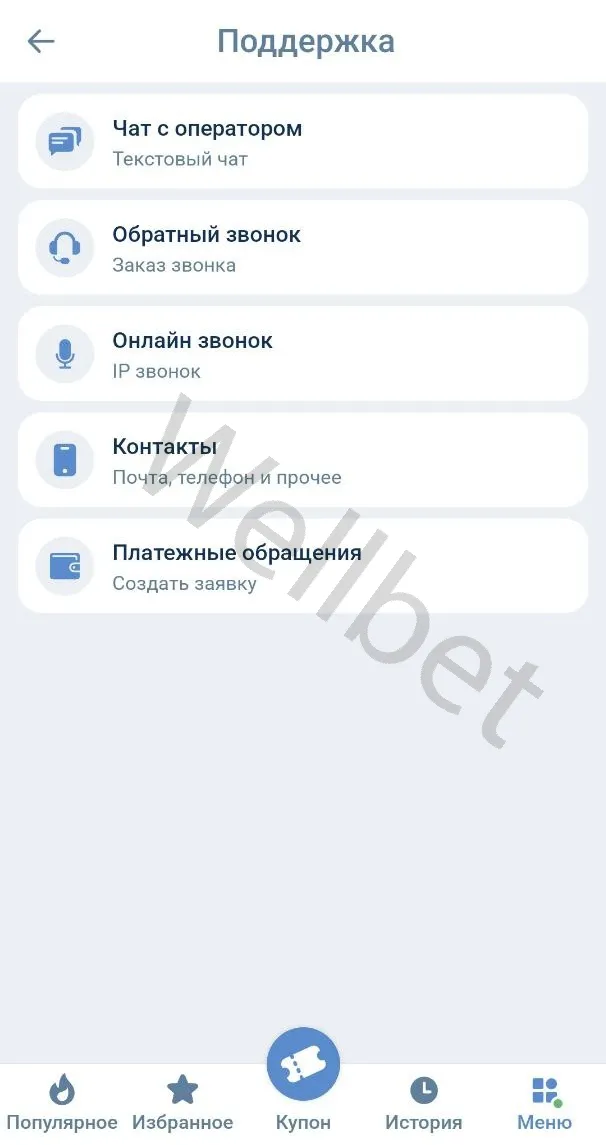 В мобильном приложении букмекер предлагает 4 варианта поддержки клиентов: