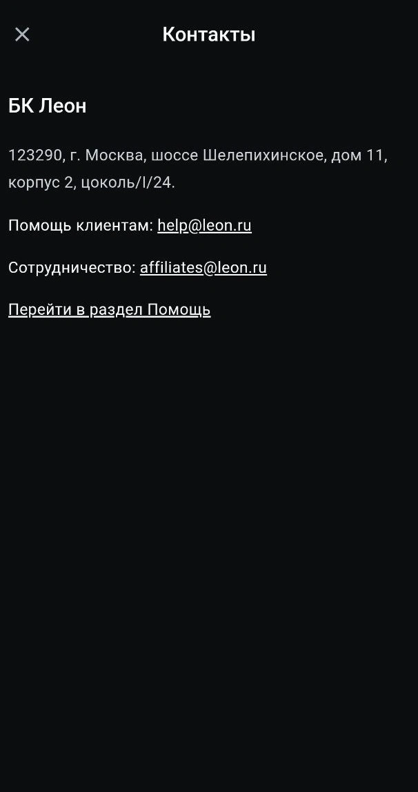 Поскольку горячей телефонной линии у букмекерской конторы Leon нет, так как связаться по номеру невозможно, самым распространенным и хорошим вариантом обращения в саппорт является email. Письмо нужно писать на адрес help@leon.ru. Вся контактная информация компании находится в разделе меню «Контакты».