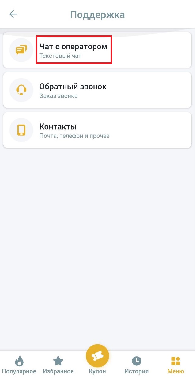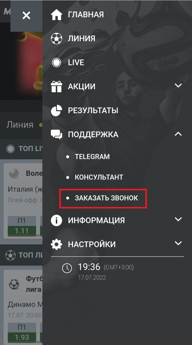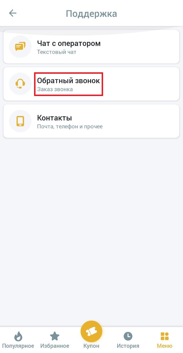 - Приложение – перейдите в «Меню» -> «Разное» -> «Поддержка» -> «Обратный звонок», укажите личные данные и тему обращения.