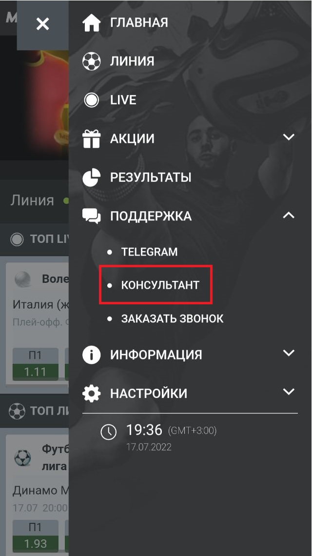 - Мобильную версию – в правом верхнем углу потребуется последовательный свайп «Меню», «Поддержка», «Консультант» и клик по кнопке «Позвать консультанта».