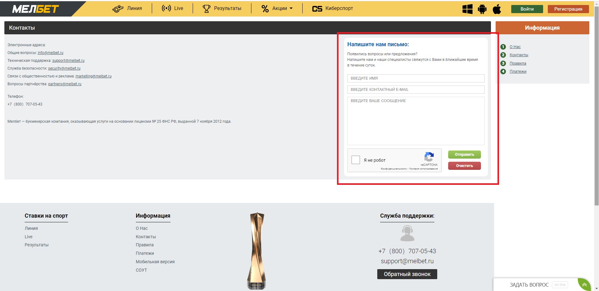 Отправить письмо специалистам букмекерской конторы также можно через веб-версию. Для этого необходимо открыть раздел «Информация» в нижней части сайта и нажать «Контакты». В открывшемся окне в правой части появится форма обратной связи – аналог почтового клиента для ПК.