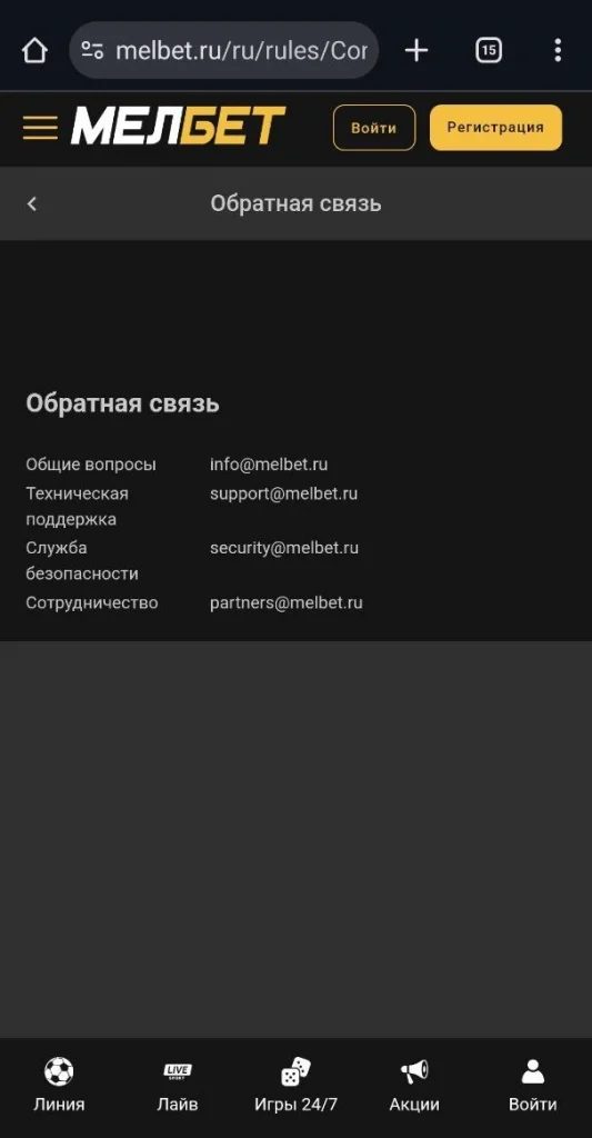 Заполнив форму, можно связаться со службой помощи «Мелбет». Письмо с ответом обычно приходит на указанный пользователем электронный адрес. Время ожидания составляет не более 1 часа.