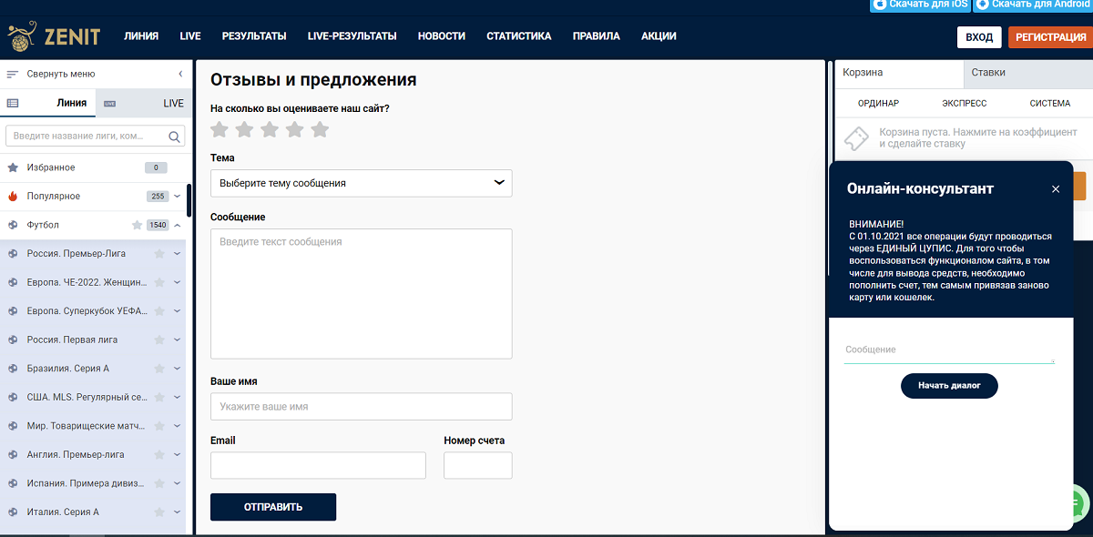 Букмекер имеет собственное мобильное приложение Зенит для устройств с ОС Андроид и iOS, которое сохраняет весь необходимый функционал. Получить ответ техподдержки на запрос удобнее всего через форму обратной связи, которая находится в кабинете игрока Zenitbet.