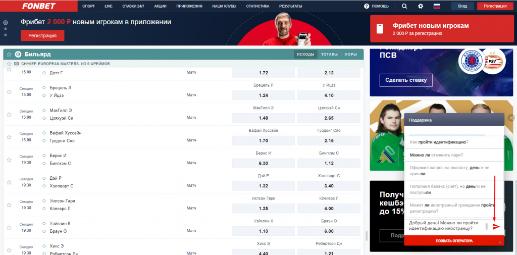 Вопрос оператору «Фонбет» можно задать через чат. Сотрудники букмекерской компании быстро решают проблемы пользователей. Время ожидания ответа — 2-3 секунды после обращения. Для запроса нужно: