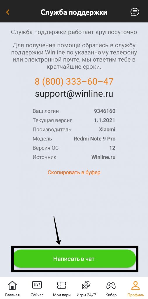 Контакты поддержки Winline представлены в одноименном разделе приложения, а также в нижней части каждой страницы сайта БК. В основном в службу поддержки Винлайн обращаются по номеру телефона или через чат.