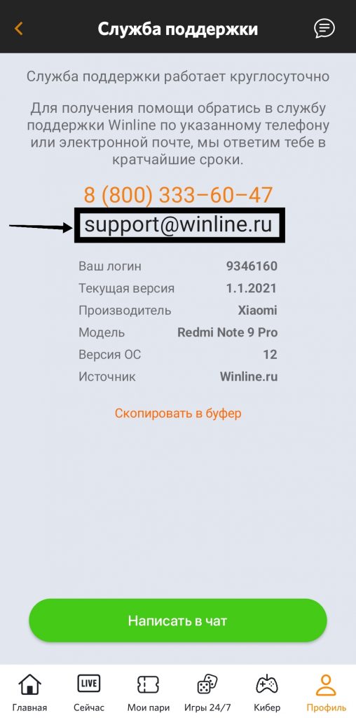 На электронную почту следует писать, если проблему не решить в чате или по номеру телефона горячей линии Winline. На 2025 год актуален адрес support@winline.ru.
