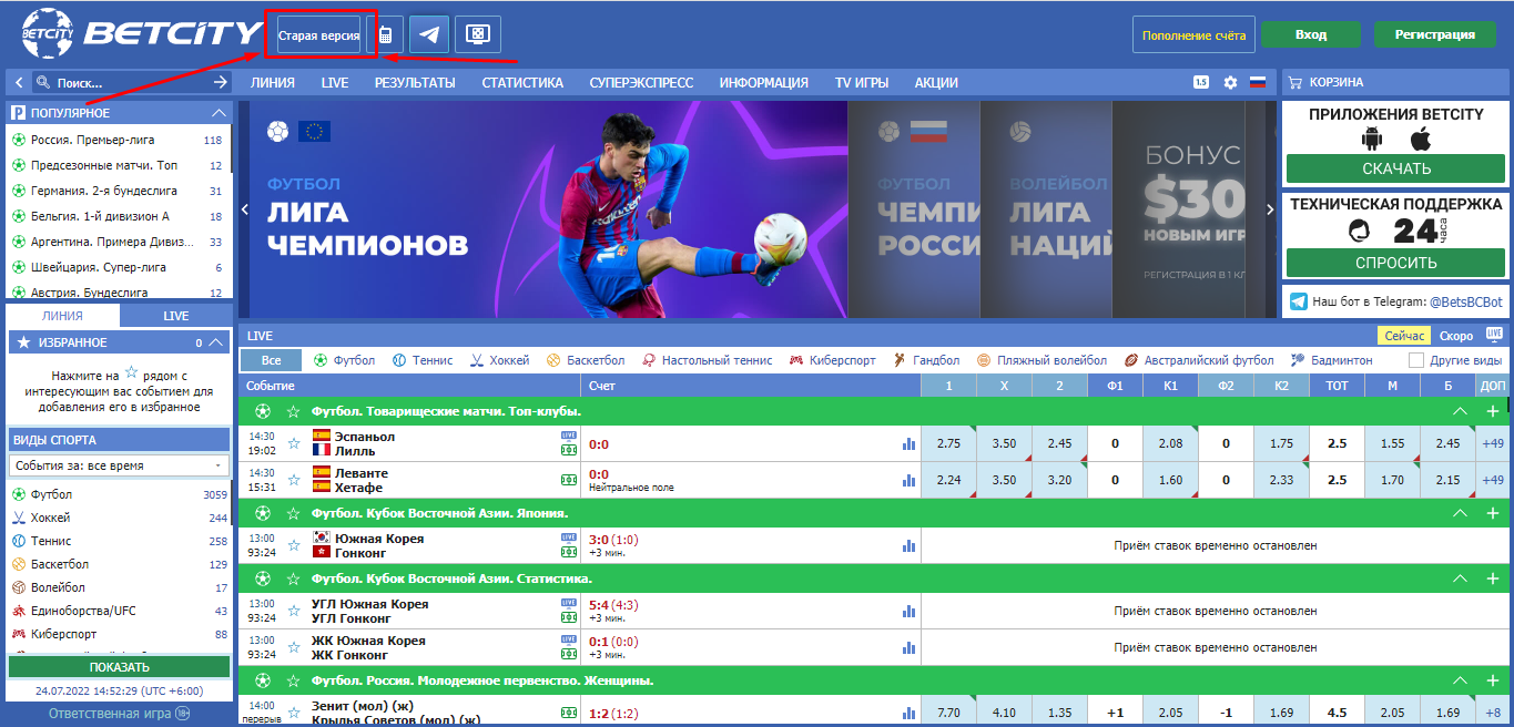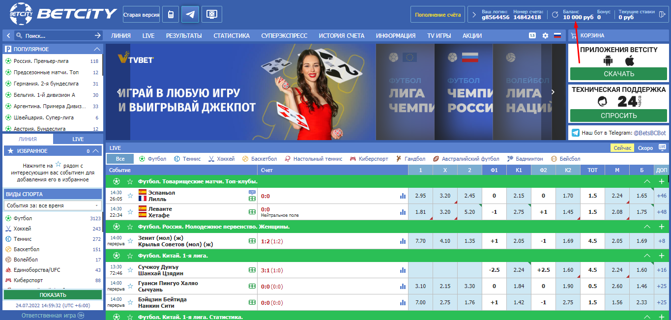 Гостевой вход у «Бетсити» позволяет играть на любых событиях. Клиентам доступны прематч и ставки лайв. Компания разрешает создавать виртуальный баланс с мобильного и десктопа. Дизайн личного кабинета при гостевом входе в «Бетсити» на 100 % совпадает с интерфейсом «основы». То есть переход с демосчета на денежный баланс будет максимально удобным для клиента.