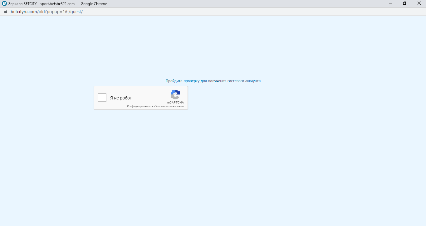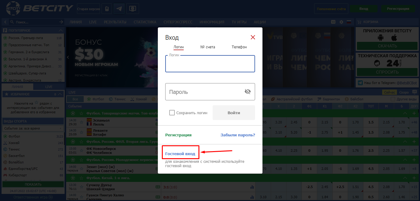- Нажать на «Гостевой вход» («Бетсити» поместил соответствующую кнопку сразу под регистрацией).