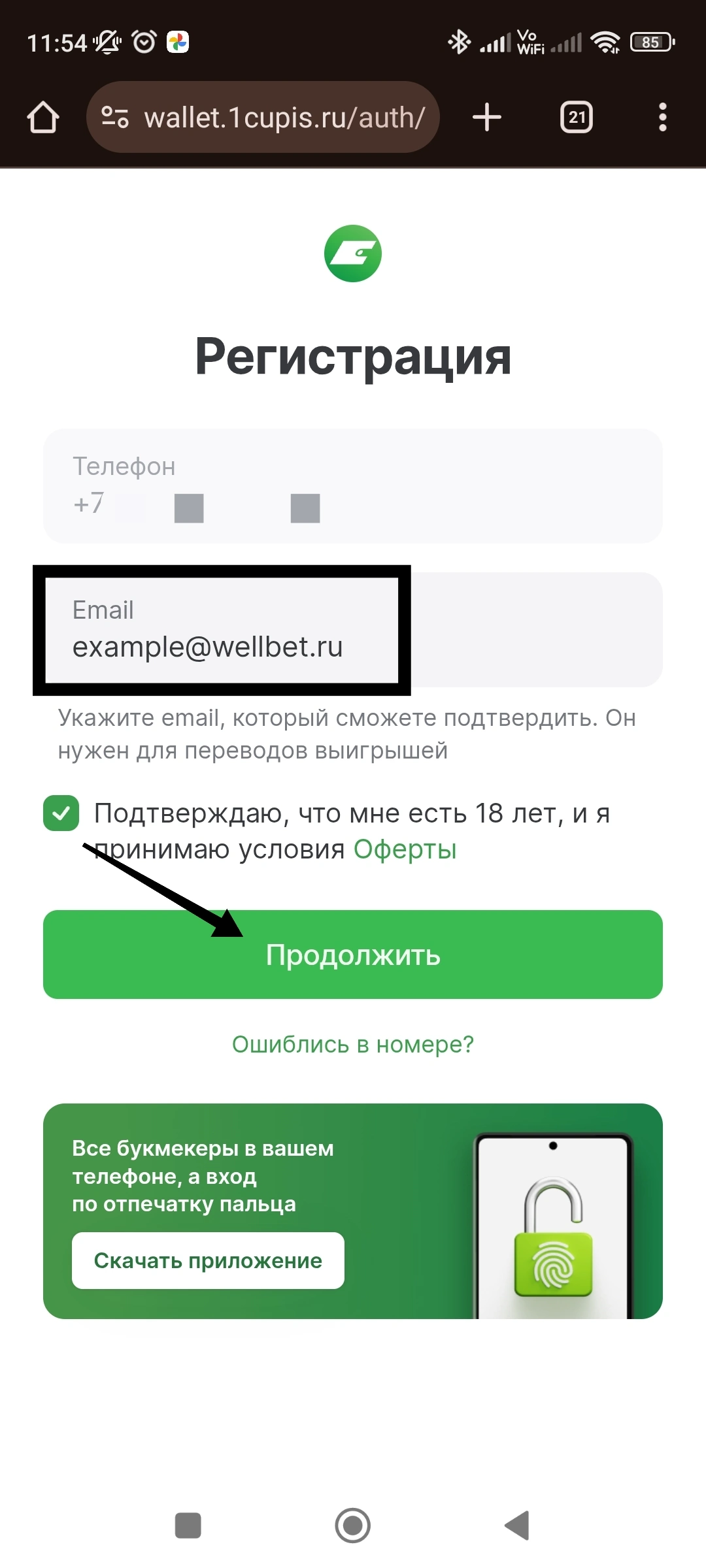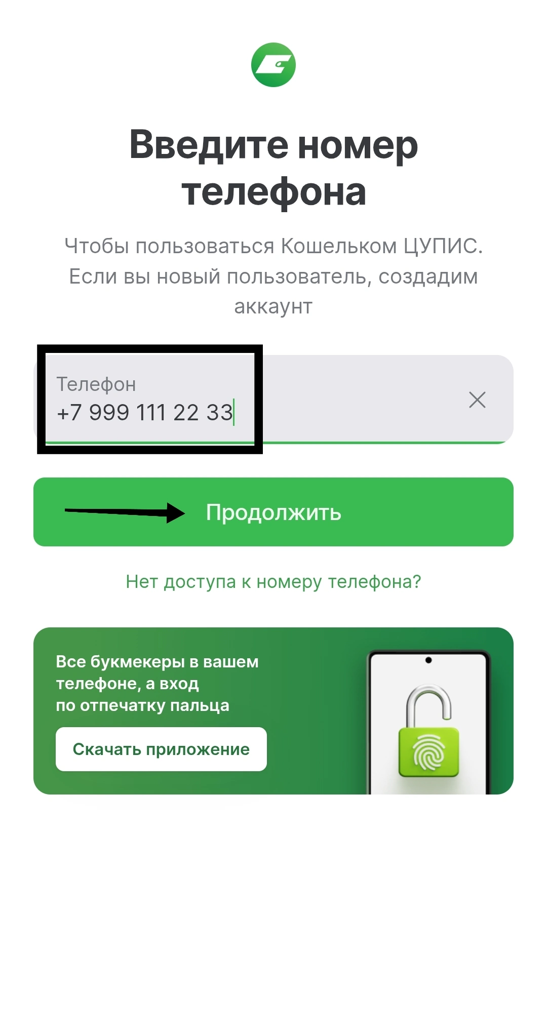 - Ввести номер телефона, привязанный к аккаунту в БК. Кликнуть «Продолжить».