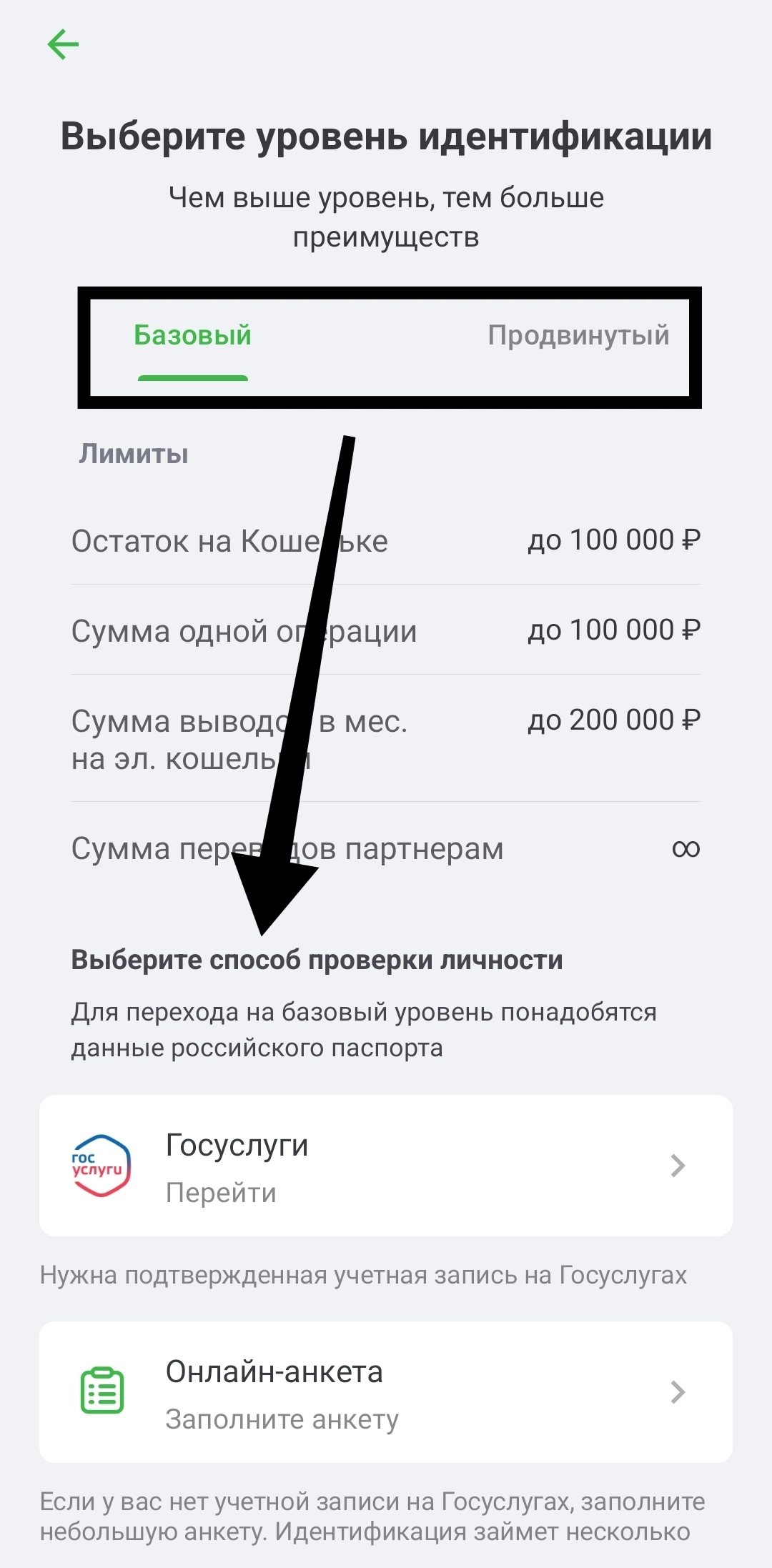 - Выбрать «Базовый» или «Продвинутый» уровень, а также способ идентификации. Пройти верификацию, следуя подсказкам сервиса.