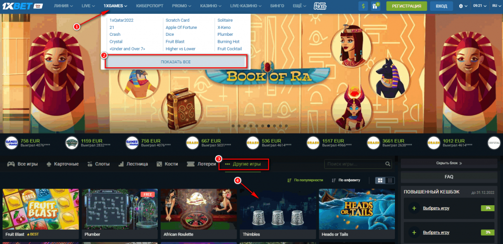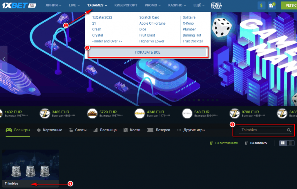 Перейдите к разделу 1xGames и кликните «Показать все». Приложение «Наперстки» в 1xBet называется Thimbles. Найти его можно на вкладке «Другие игры».