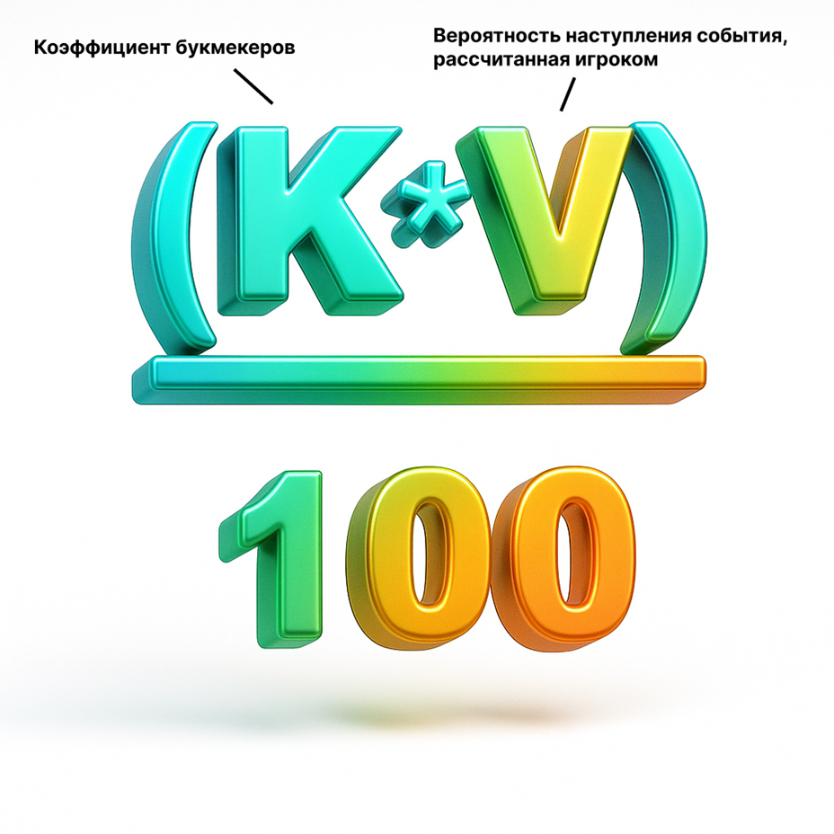 - Сравнить свою оценку исхода (V) с букмекерскими котировками (K) с помощью формулы: