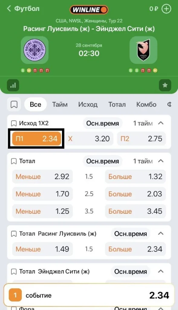 Пример актуальной валуйной ставки на сегодня. Для футбольного матча у женщин «Расинг Луисвиль» — «Эйнджел Сити» сканер нашел коэффициент на победу 1-й команды, равный 2,34.