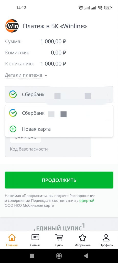Для того чтобы поменять карту в «Винлайн», необязательно удалять старую. К аккаунту может быть привязано несколько банковских карточек и электронных кошельков — ограничений в этом плане нет. Для того чтобы привязать новую, нужно перейти на сайт БК «Винлайн» в раздел пополнения счета. Выбрать в качестве платежного средства банковскую карту, указать сумму и нажать кнопку «Пополнить».
