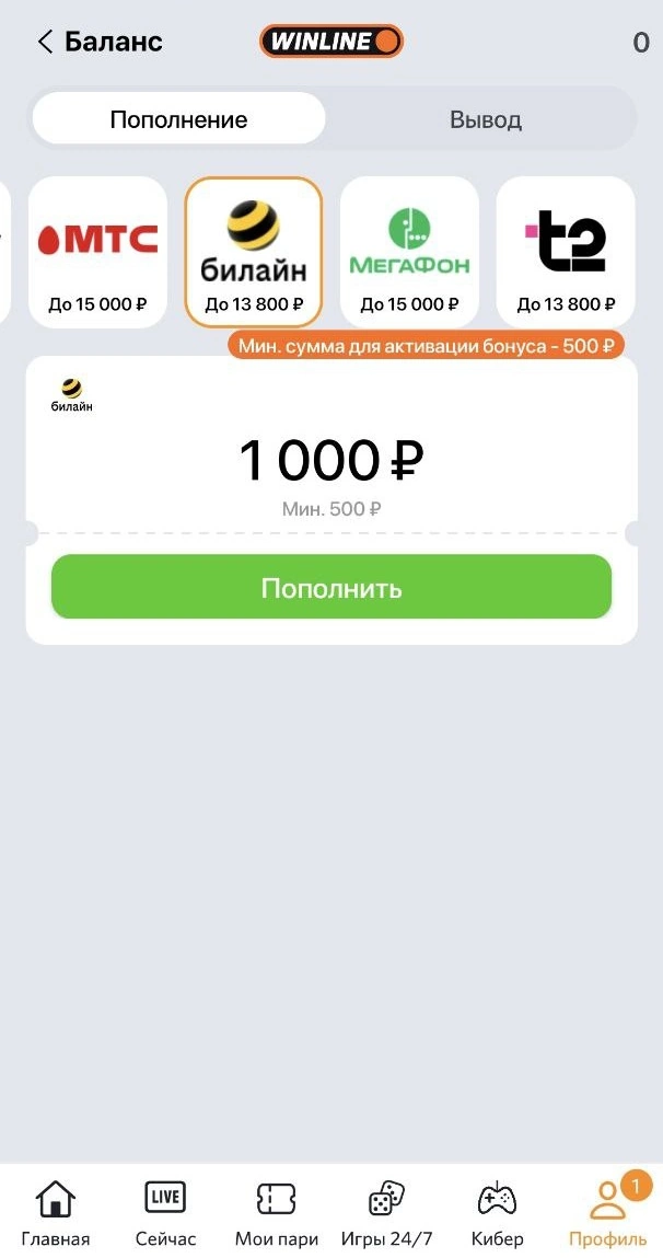 Авторизуйтесь на сайте букмекера. Откройте страницу пополнения счета и выберите нужный способ. Комиссия за перевод — от 8 до 11% в зависимости от оператора. Далее останется ввести сумму и подтвердить операцию.