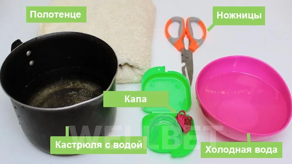 По истечении времени капу аккуратно снять и поместить в сосуд с ледяной водой на 7 минут. После охлаждения вынуть и примерить. Если результат не устраивает, можно заново варить капу.