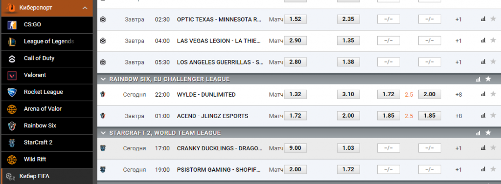 Все киберспортивные дисциплины собраны на вкладке «Киберспорт» в БК Winline: Dota 2, Counter-Strike: Global Offensive, LoL, Valorant и другие. При выборе дисциплины появляются все турниры, на которые в данные момент можно сделать ставку. Основной упор в Winline делается на CS:GO и Dota 2, так как эти две игры пользуются большой популярностью в России.