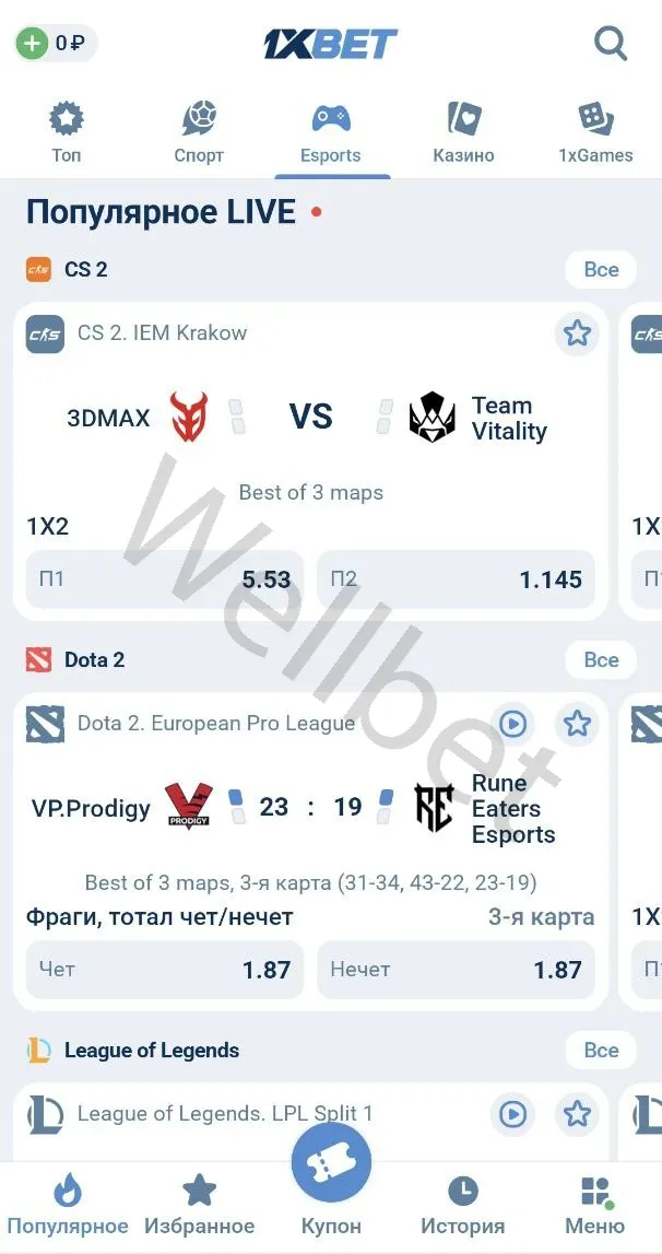 Раздел «Киберспорт» охватывает известные турниры. Традиционный ТОП-3 включает CS:GO, LoL и Dota2. В дополнение к ним идут матчи симуляторов FIFA, NHL, UFC и НБА. Доступны ставки на Mortal Kombat, Sonic и карточные игры.