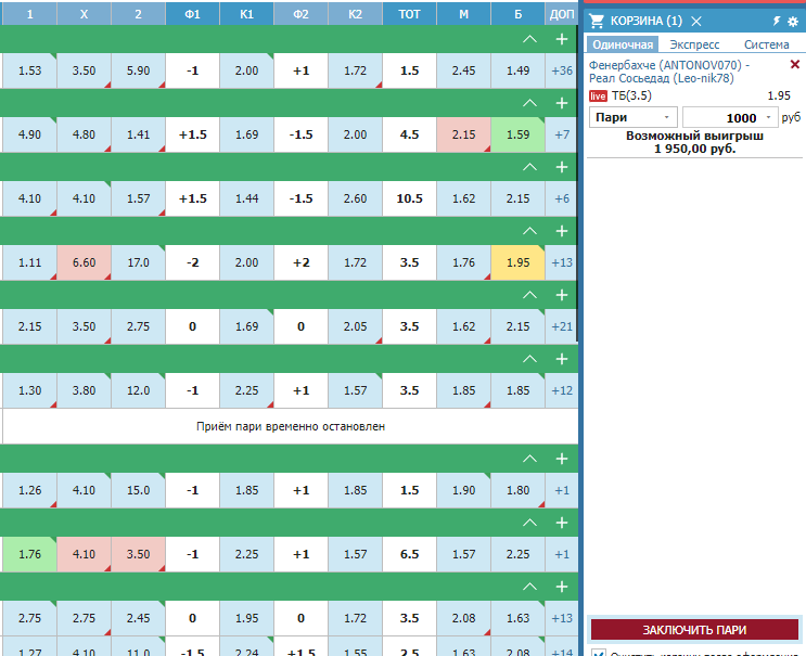 | Возможность заключать ставки в один клик | Тяжело оформить ставку типа экспресс или система из-за быстрых изменений в коэффициентах |