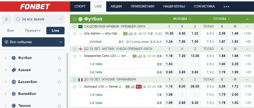 В Фонбет лайв-ставки доступны в разделе сайта «Спорт». Выбрать можно всю линию или только самые популярные события. Сайт Fonbet делит онлайн-ставки по: