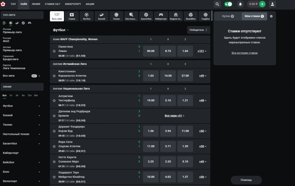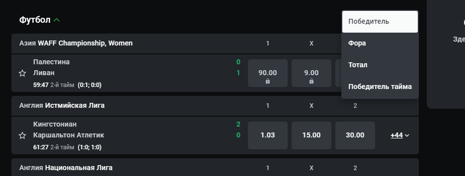 Доступна сортировка по основному виду исхода. По умолчанию стоит победитель матча. Но если беттера больше интересуют другие рынки, то он может выбрать тоталы, форы или победителя в тайме.
