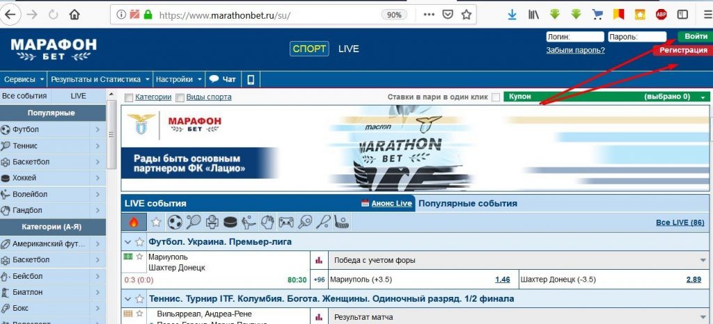 Букмекерская контора «Марафон» позволяет войти на сайт, имея на руках логин и пароль. Регистрация бесплатная, однако для заключения первого пари необходимо пополнить счет.