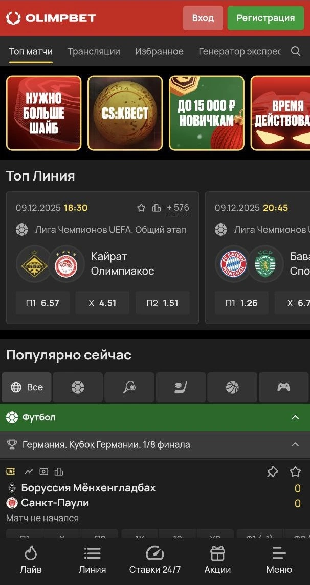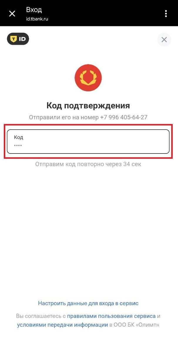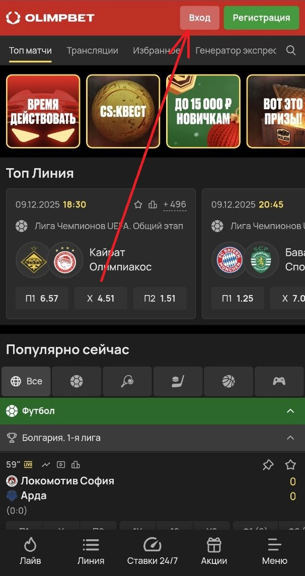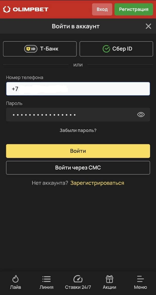На сайте Olimpbet или в приложении нажмите «Войти», введите логин и пароль. Может потребоваться код из СМС.