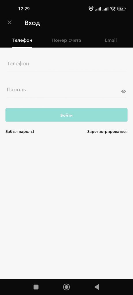 По умолчанию в качестве логина установлен номер телефона. Для использования номера счета и электронной почты нужно переключить вкладку. Пароль для всех трех способов одинаковый.