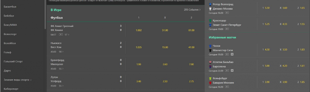 Линия в Live по стилю построения копировала предматч. Основное внимание букмекер давал футболу. Именно матчам этой игры создали максимальную представленность. Остальные виды спорта тоже появлялись, но количество встреч было ниже.