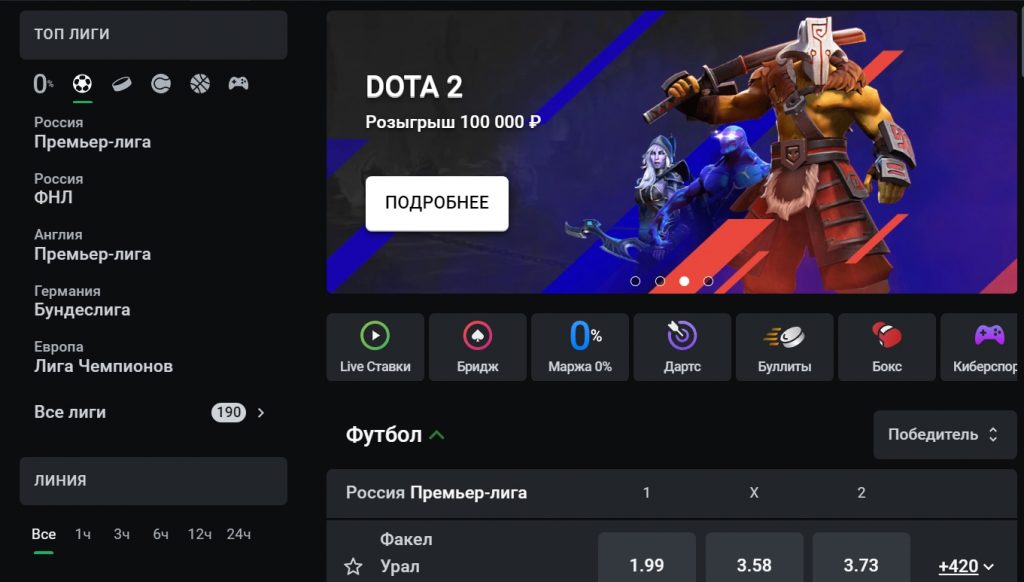 Открыть линию просто — она расположена на странице официального сайта букмекерской фирмы «Леон». Слева есть колонка с доступными видами спорта и показами Live с востребованными матчами, что должны начаться в ближайшие сутки. В этой же колонке публикуют список турниров и матчей.