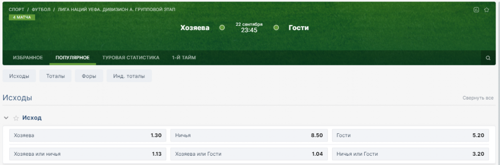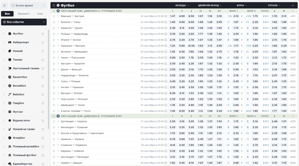 В БК «Пари» линия называется «Спорт». В разделе представлены все события, на которые можно сделать ставку до начала матча. После начала игры событие переходит в раздел Live.