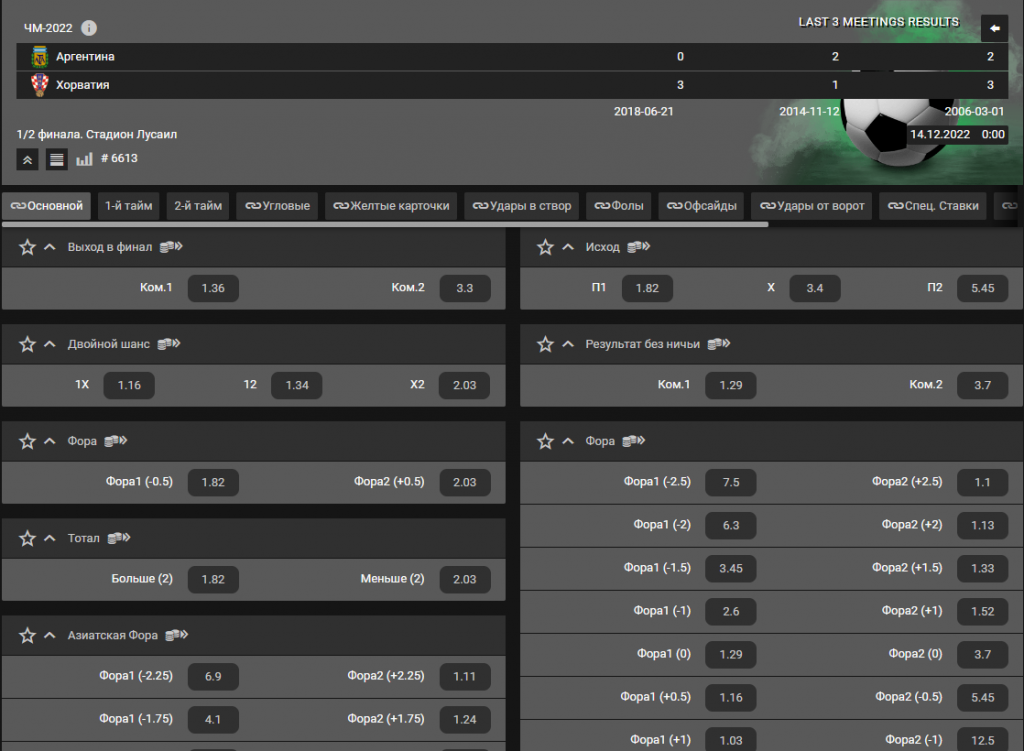 Роспись зависит от популярности матча. На самые главные встречи, например, игры Чемпионата мира беттерам доступно более 2500 различных исходов. Они включают в себя не только тоталы и форы, но и ставки на статистические данные, например, угловые и удары в створ ворот.
