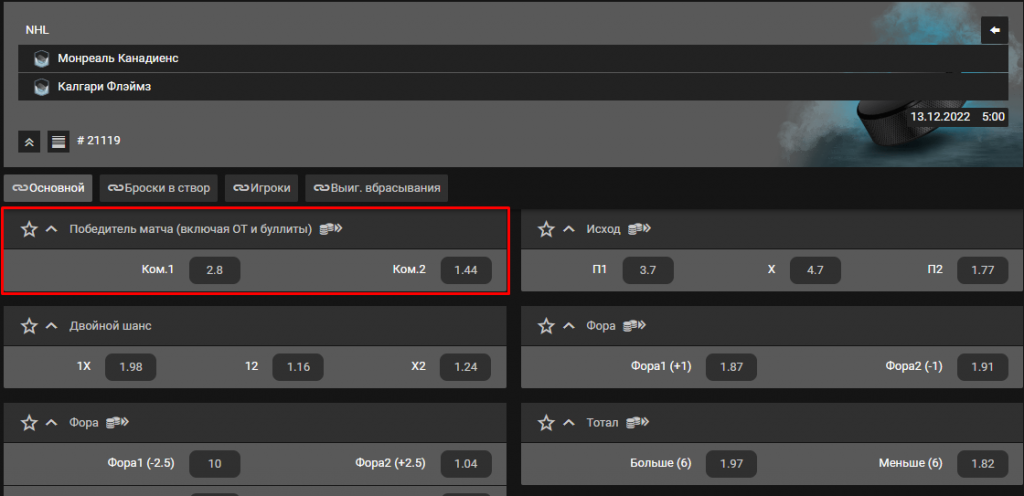 Хоккейный матч не может закончиться вничью. Если команды за 3 периода не выявили сильнейшего, то будет сыгран овертайм и, возможно, серия буллитов. Но в ставках учитывается результат, полученный в основное время. Можно заключить пари на победителя матча с учетом возможного дополнительного периода и буллитов — в росписи это событие выделено отдельно.