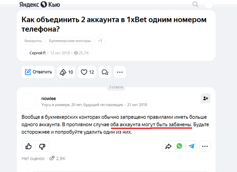 Формально в 1xBet нельзя объединять аккаунты. При выявлении мультиаккаунтинга БК вправе заморозить, заблокировать или полностью удалить как часть, так и все счета нарушителя. Но в отдельных ситуациях компания все-таки может пойти навстречу. Примеры таких исключений:
