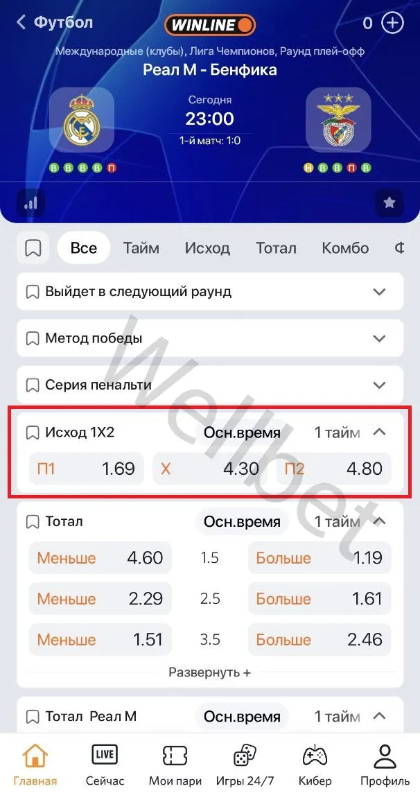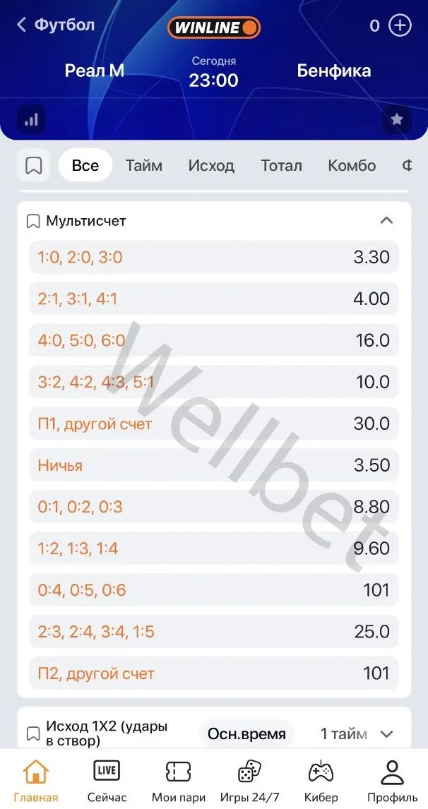 Для примера возьмем матч Реал Мадрид — Бенфика, который пройдет в рамках Лиги Чемпионов. Ставки на мультисчет в «Винлайн» можно сделать во вкладке «Все». Вот какие коэффициенты предлагает букмекер на эту встречу: