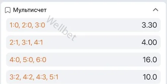Мультисчет в «Винлайн» — комбинированный тип пари, при котором игрок делает ставку на несколько возможных точных счетов в матче.