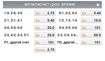 Все предложенные варианты даются на победу одной из команд. Взять несколько популярных счетов не получится. Например, варианта ставки 1:0, 1:1, 0:1 в «Винлайн» нет, так как она противоречит принципу мультисчета.