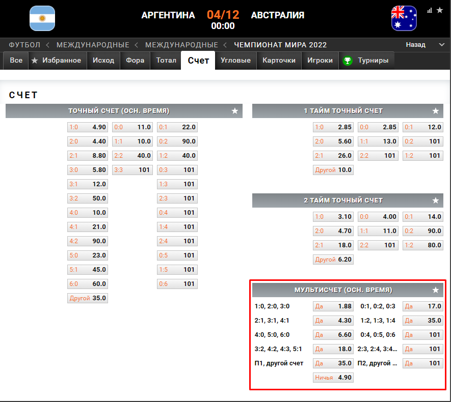 Мультисчет — комбинированная ставка, поэтому если победит Австралия, например, со счетом 0:1, то пари будет проигранным. Для Австралии есть свой вариант мультисчета на такие же исходы, но с коэффициентом 17.