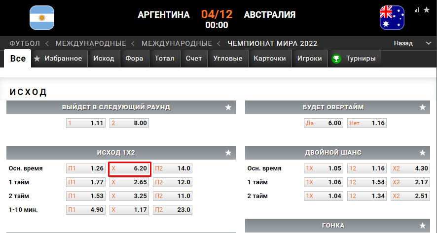 Для примера возьмем матч Аргентина — Австралия, который пройдет в рамках Чемпионата Мира по футболу. Ставки на мультисчет в «Винлайн» можно сделать во вкладке «Счет». Вот какие коэффициенты предлагает букмекер на эту встречу: