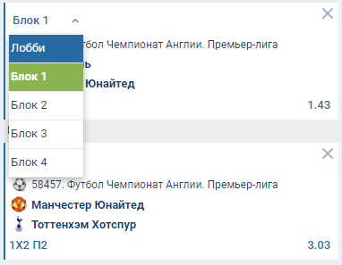 После выбора типа пари появляются блоки. Изначально все события выделены в каждый блок. Игроку необходимо составить их нужным для себя образом. Для этого нужно кликнуть на номер блока.