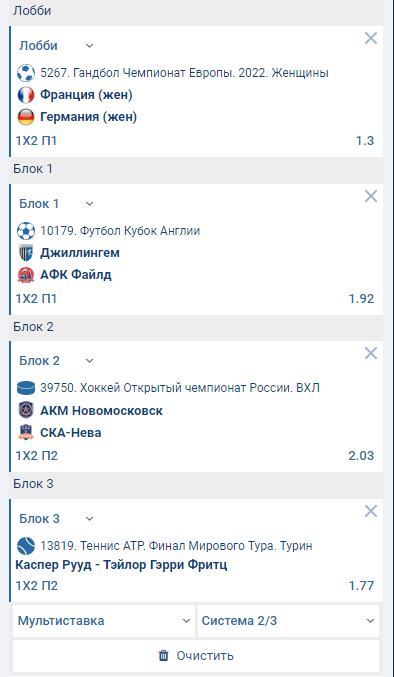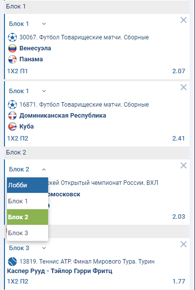При оформлении мультиставки в 1xBet все события, добавленные в купон, делятся на блоки. В каждом — одиночная ставка или экспресс. Такой тип пари должен содержать в себе минимум 3 блока.