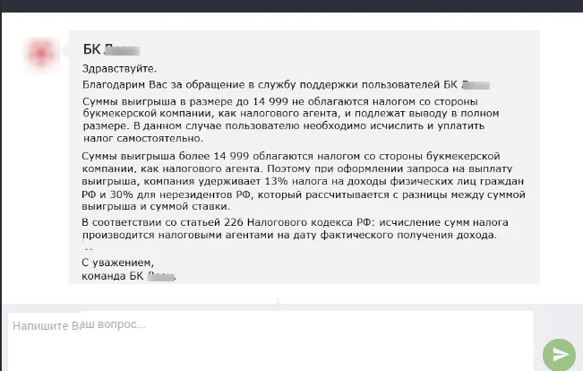 Для любых игроков букмекерских контор действует налог на доход физических лиц — это налоговая база НДФЛ. В России она составляет 13% от чистой прибыли. Если всех материалов сайта мало, информацию можно уточнить у службы поддержки букмекера.