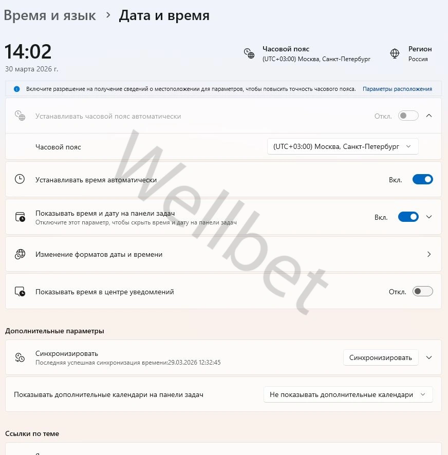 Сайт букмекерской конторы «Олимпбет» работает на протоколе https. Если время на компьютере не совпадает с фактическим, сайт БК не откроется. И чтобы решить эту проблему, нужно проверить дату и время. А чтобы ошибка не повторялась, включите автоматическое определение времени в настройках.