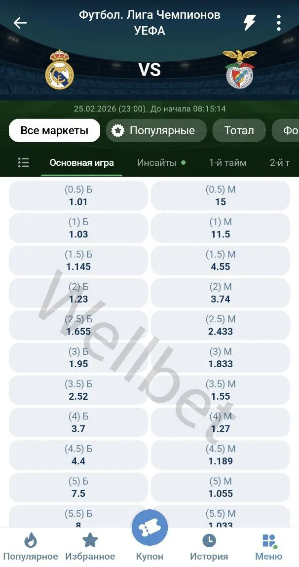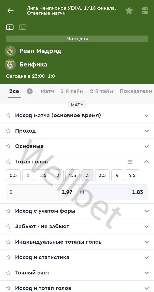 Для того чтобы понять, насколько больше различие в росписи, достаточно посмотреть, какую роспись дают букмекеры на тоталы в матче «Реал Мадрид» — «Бенфика». Fonbet открывает роспись, начиная со значения в 0,5 гола и закрывает на значении 4,5 мячей.