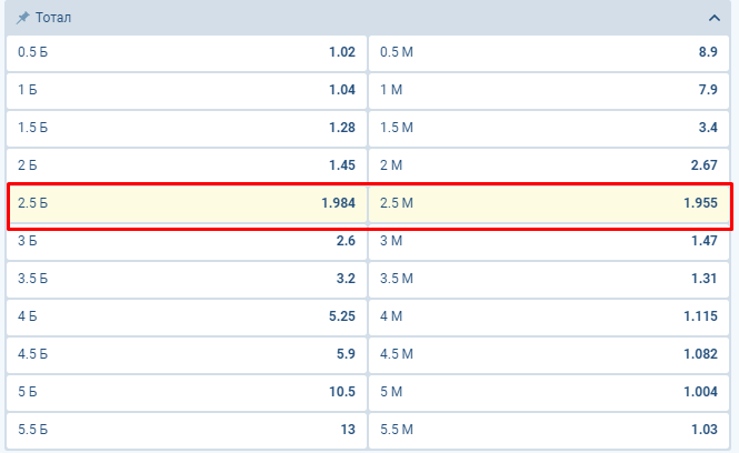 Например, на матч «Челси» — «Арсенал» на тоталы голов «1хБет» дает следующие коэффициенты: