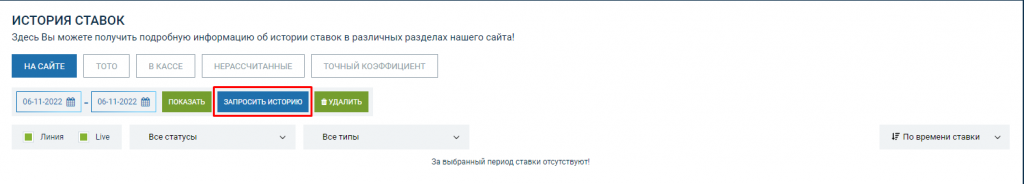 Получить удаленную историю можно в виде текстового файла. В этом же разделе нужно выбрать период, за который нужно получить все пари, после чего нажать кнопку «Запросить историю».