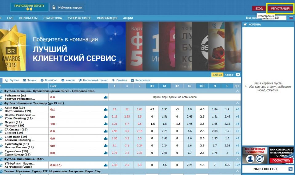 По правилам «Бетсити», пари заключаются на итог основного времени, если не прописано иное. Исключение – количество голов, которые забили спортсмены, и пропущенных в ворота мячей. Есть возможность оформлять ставки на то, какой из участников займет лучшую позицию в состязании.