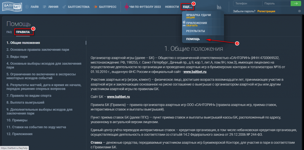 Узнать об условиях приема и расчета ставок можно на официальном сайте компании. Просто наведите курсор на кнопку «ЕЩЕ…» и перейдите в раздел «Помощь». Подробная информация доступна на вкладке «ПРАВИЛА».